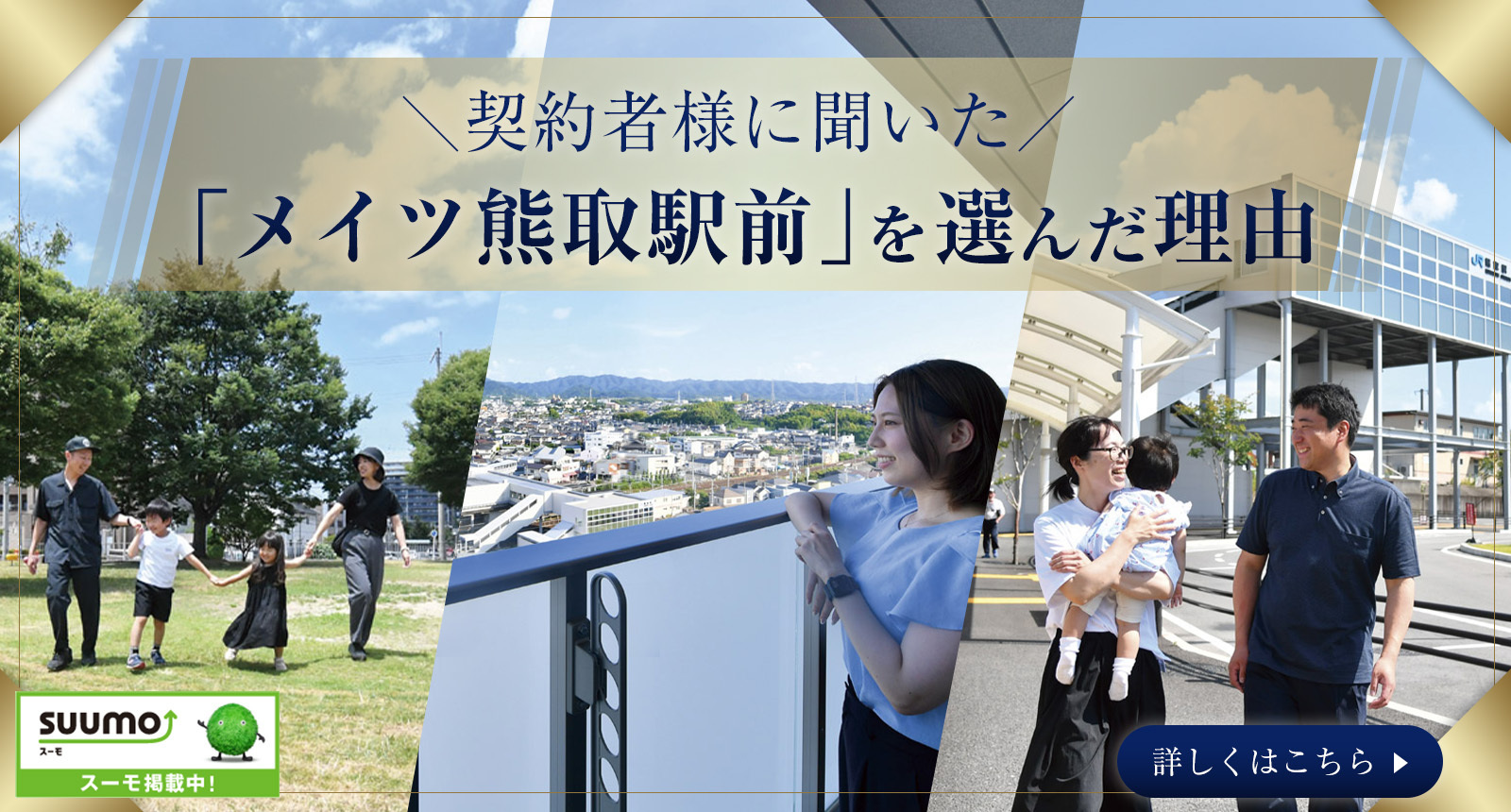 - ※1:メイツ熊取駅前は、泉佐野市にて2024年に供給された新築分譲マンション(投資用除く)において「成約戸数No.1」です。(MRC調べ)