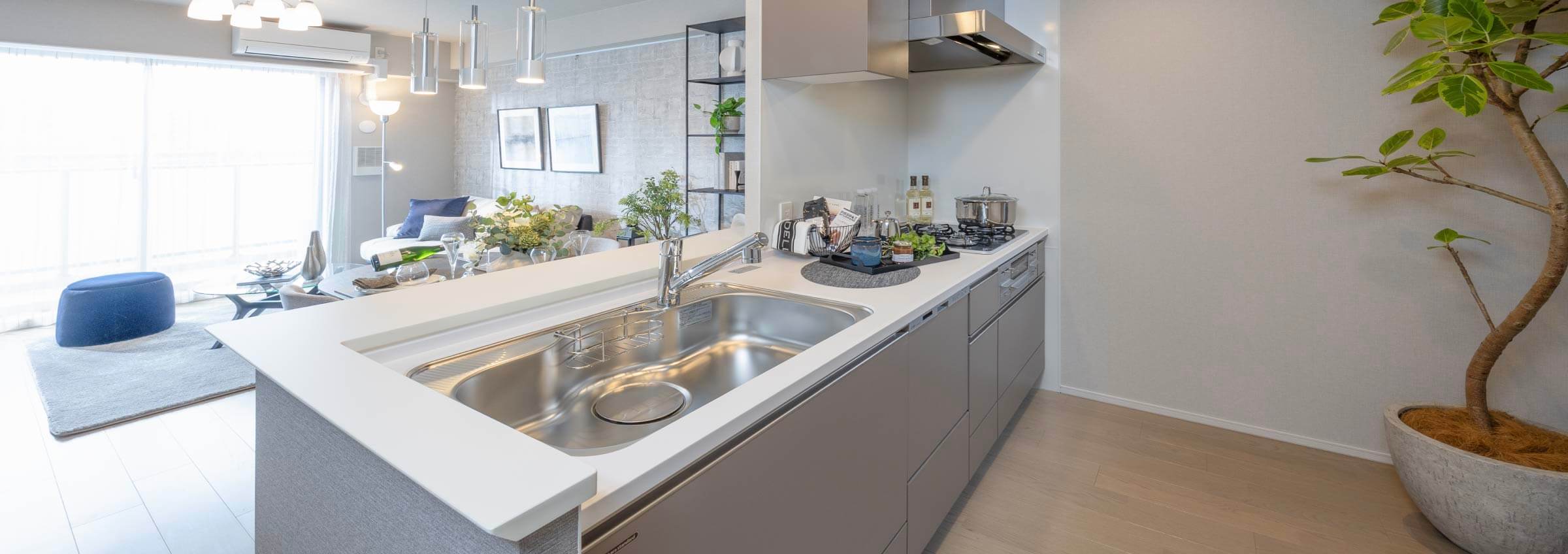 リビングダイニングとの一体感を愉しむ、オープンカウンターキッチン。料理をする時間も、語らいの時間も、すべてがシームレスにつながる心地よい空間設計です。