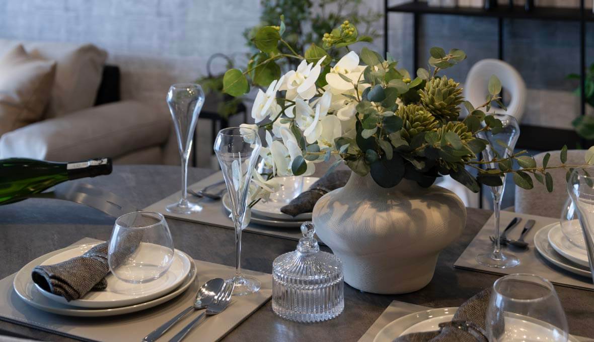 グレージュとダークブラウンが織りなす深いコントラストが、リッチな雰囲気を醸し出すリビング・ダイニング。ガラスの艶や流行の暖色系をアクセントに加え、落ち着きの中に華やかさが宿る空間を演出します。