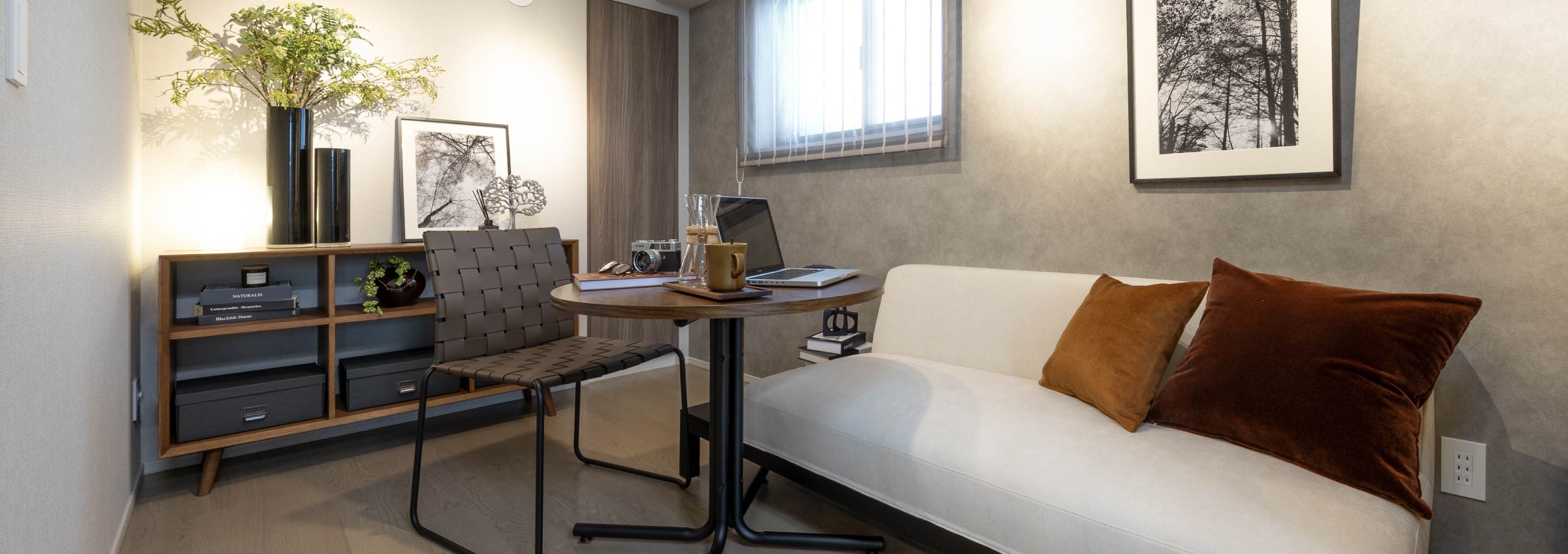 壁面にあしらった質感豊かなアクセントクロスやグリーンが、自然素材の家具と調和し、穏やかな時間が流れます。