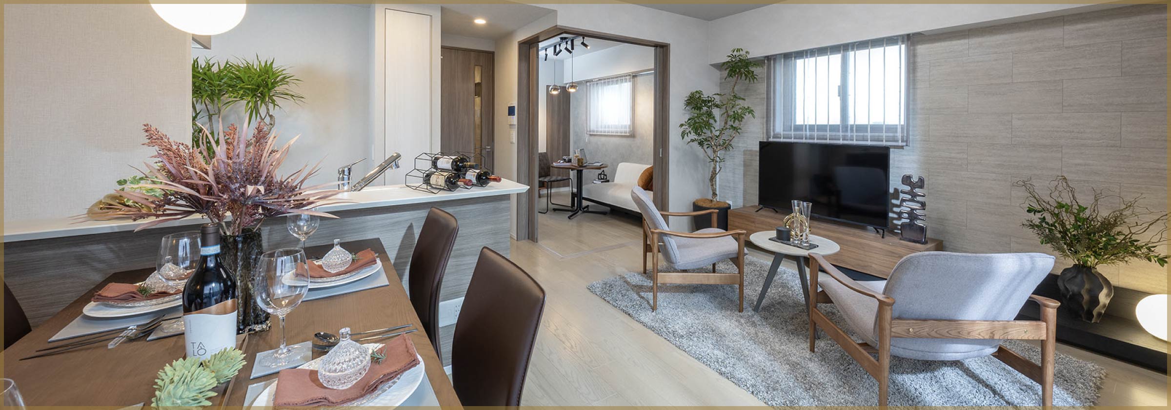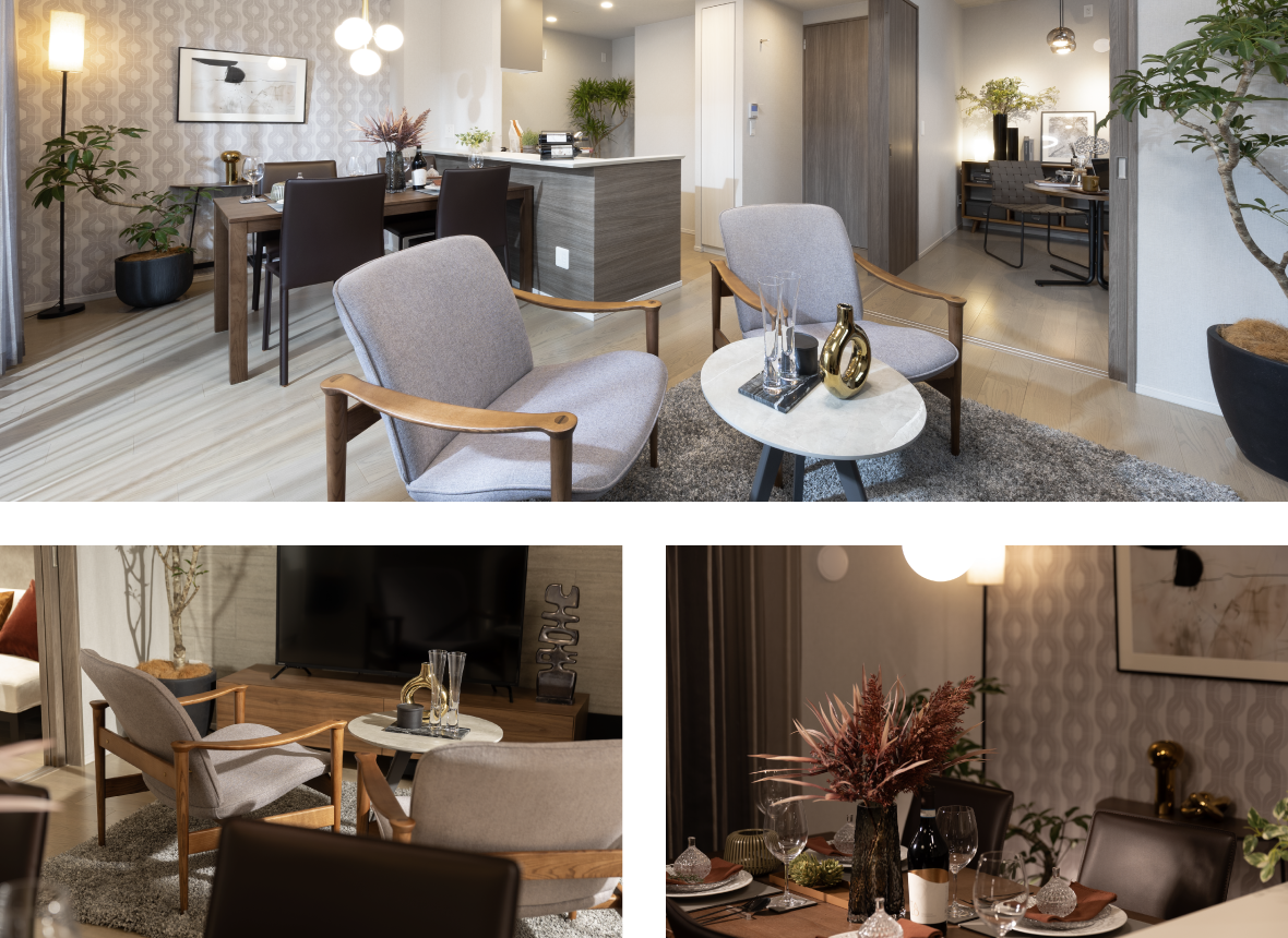 グレージュとダークブラウンが織りなす深いコントラストが、リッチな雰囲気を醸し出すリビング・ダイニング。ガラスの艶や流行の暖色系をアクセントに加え、落ち着きの中に華やかさが宿る空間を演出します。